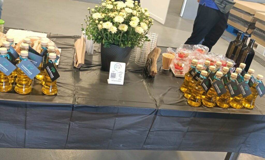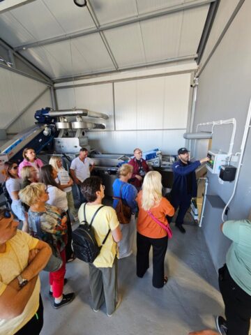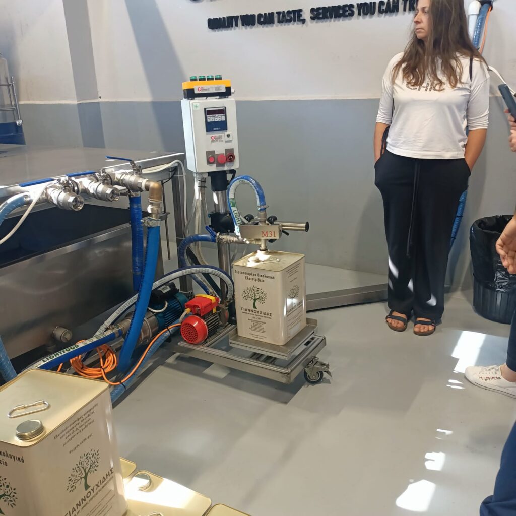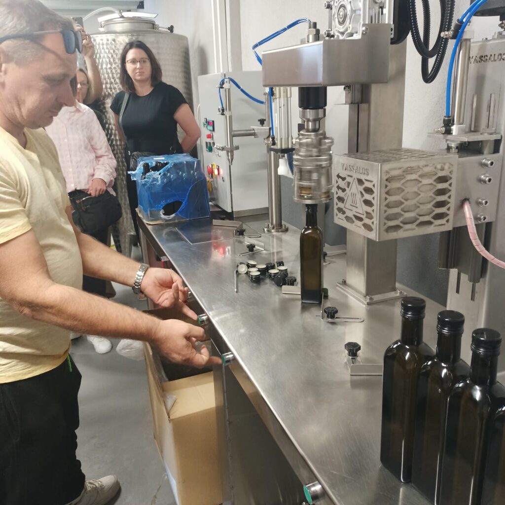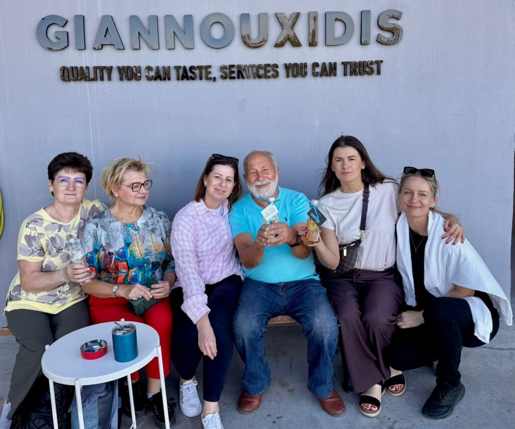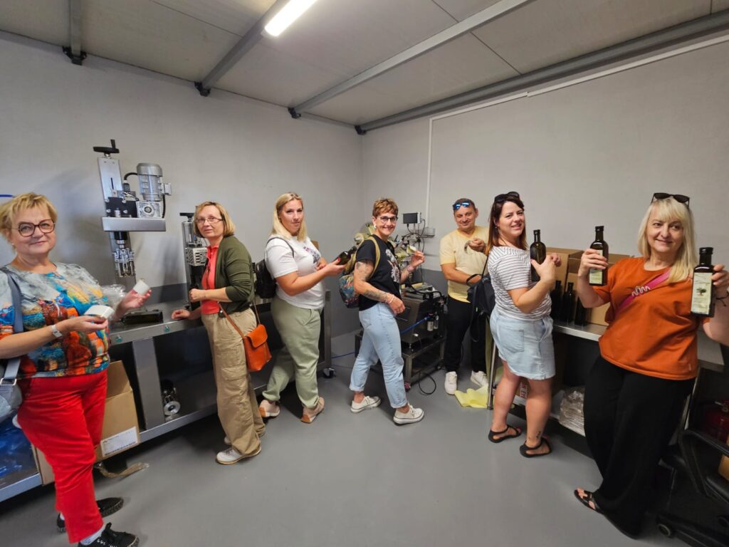 W tym dniu odwiedziliśmy również certyfikowaną ekologiczną tłoczarnie oliwy z oliwek tłoczonej na zimno oraz plantację oliwek „Giannouxidis”. Jest to firma rodzinna prowadzona od trzech pokoleń, założona przez dziadka obecnego właściciela. Oliwa z oliwek jest nieodłącznym elementem greckiej tradycji. Jest symbolem zdrowia, długowieczności i gościnności. Tłoczarnia „Giannouxidis” łączy ekologię, zrównoważony rozwój i innowacje. W 2023 roku dzięki dofinansowaniu z programów unijnych zostały zakupione nowe maszyny, co znacząco usprawniło pracę. Jest to jedna z najnowocześniejszych tłoczarni oliwy z oliwek w Grecji, w której cały proces odbywa się przy minimalny zużyciu wody. Podczas naszej wizyty mogliśmy obejrzeć każdy z etapów powstawania oliwy, a na końcu samodzielnie napełnić butelki powstałą oliwą, co spotkało się z dużym entuzjazmem i zainteresowaniem uczestników. Linia butelkująca oliwę to najnowszy nabytek, zakupiony zaledwie kilka tygodni temu. Na uwagę zasługuję także fakt, że w całym procesie powstawania oliwy, wszystkie produkty uboczne podlegają dalszemu wykorzystaniu. Pestki są magazynowane i odbierane przez firmę, którą wytwarza z nich biodiesel. Natomiast liście i skórki pozostałe z tłoczenia oliwy mają zastosowanie jako nawóz. Tłoczarnia posiada także panele fotowoltaiczne, dzięki czemu energia elektryczna generowana jest w dużej mierze ze słońca, co prowadzi do znaczących oszczędności na rachunkach za prąd oraz zwiększa niezależność od rosnących cen energii. Firma Giannouxidis jest idealnym przykładem jak łączyć innowacyjną technologię przy jednoczesnym poszanowaniu natury, ochrony środowiska i tradycji.