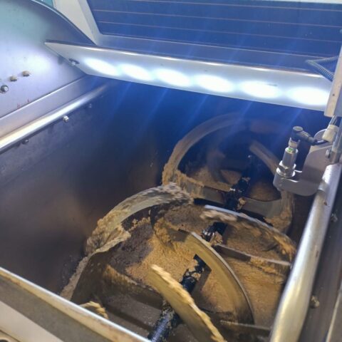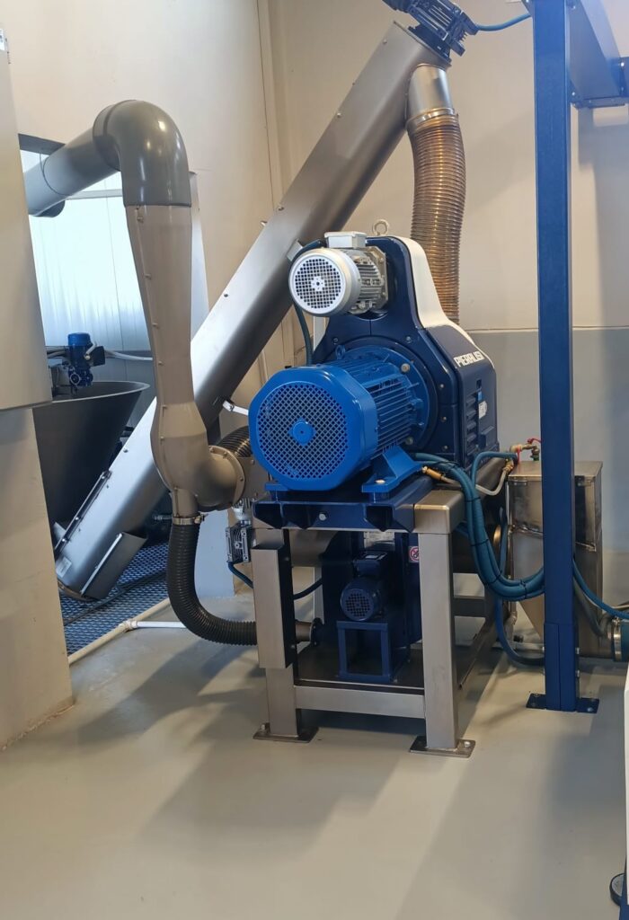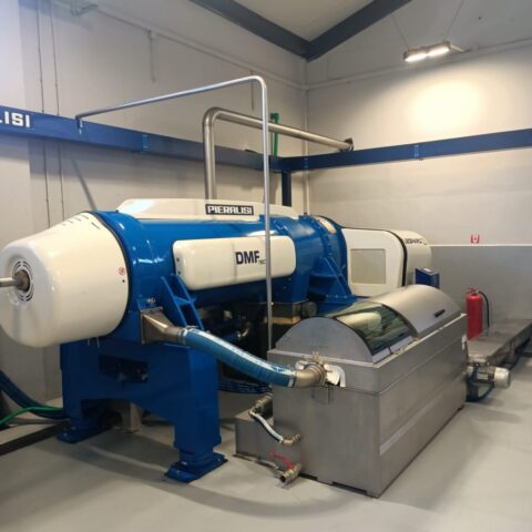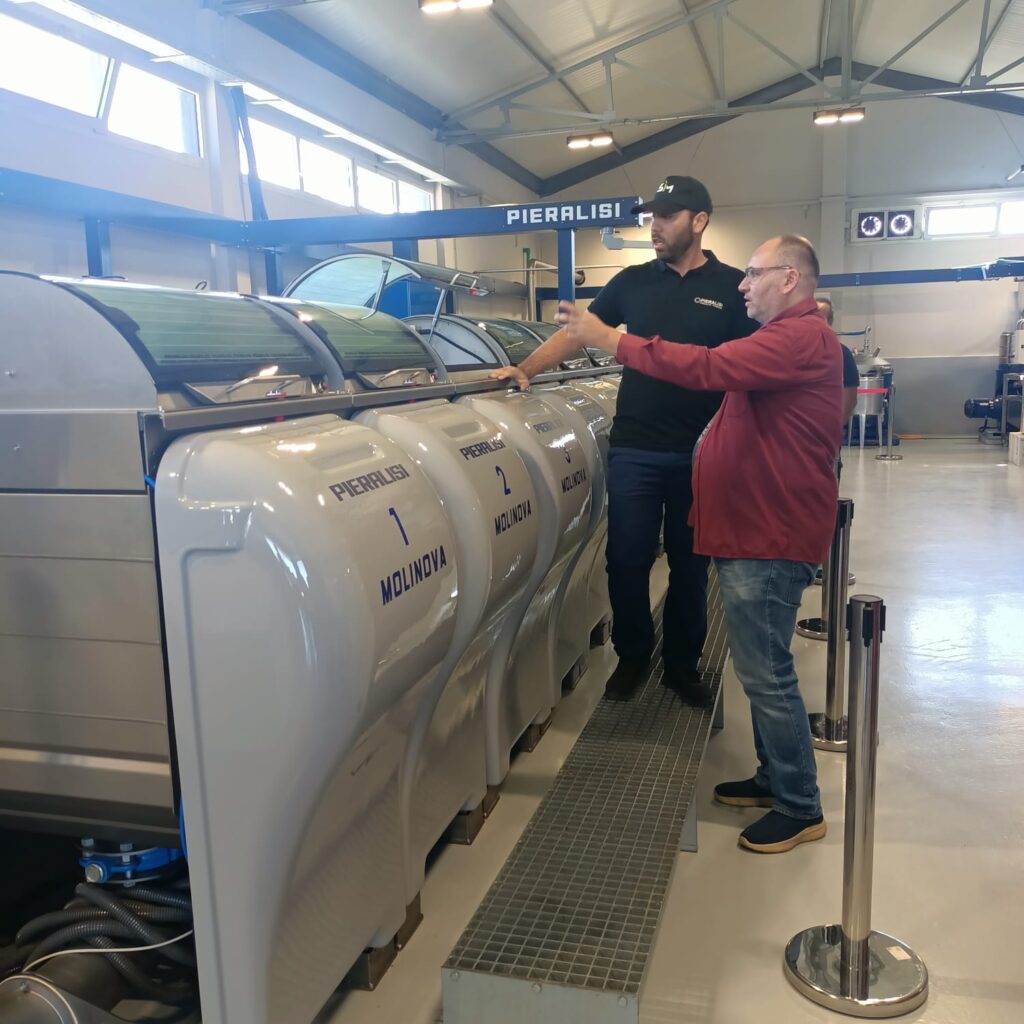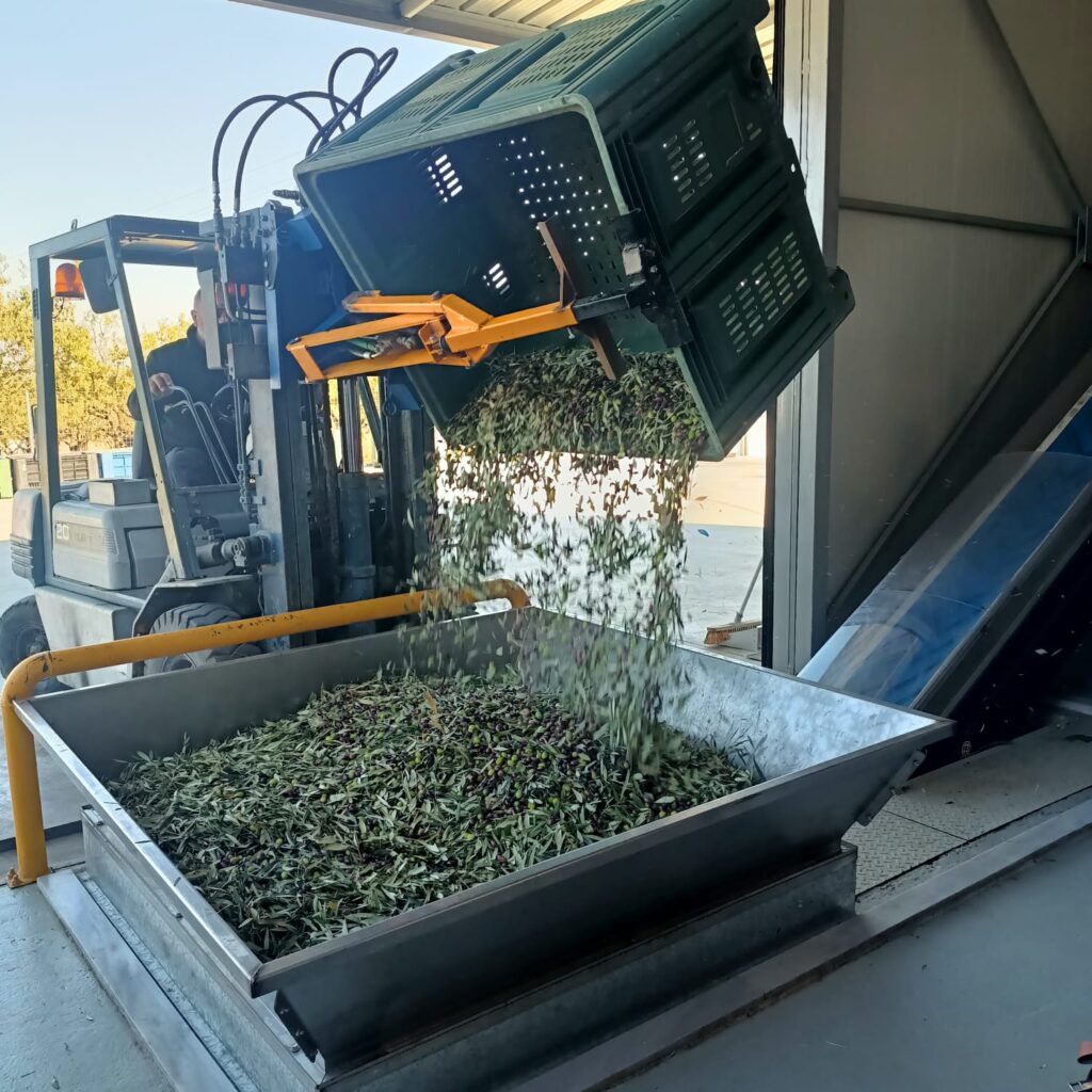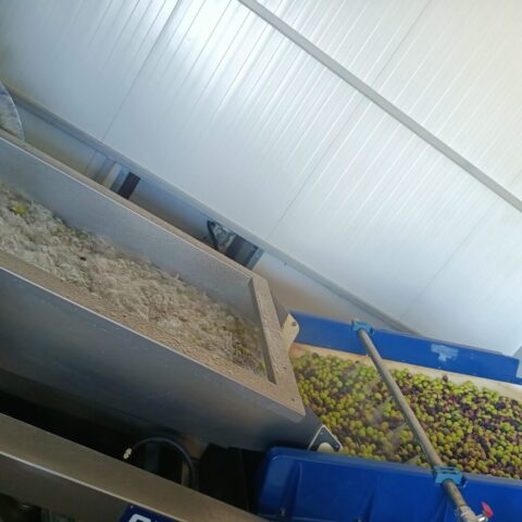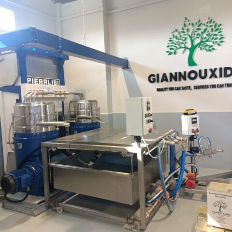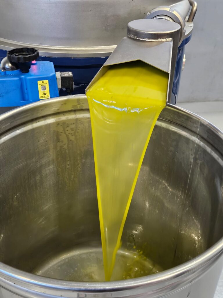 5. Pasta z oliwek pod wpływem ciśnienia powietrza trafia do zbiorników, w których młynki tłoczą oliwę – proces ten odbywa się w temp. Do 35oC i trwa około 30-40 min. co pozwala zachować wszystkie naturalne właściwości, smak i aromat oliwy. Powstaje oliwa z pierwszego tłoczenia na zimno.