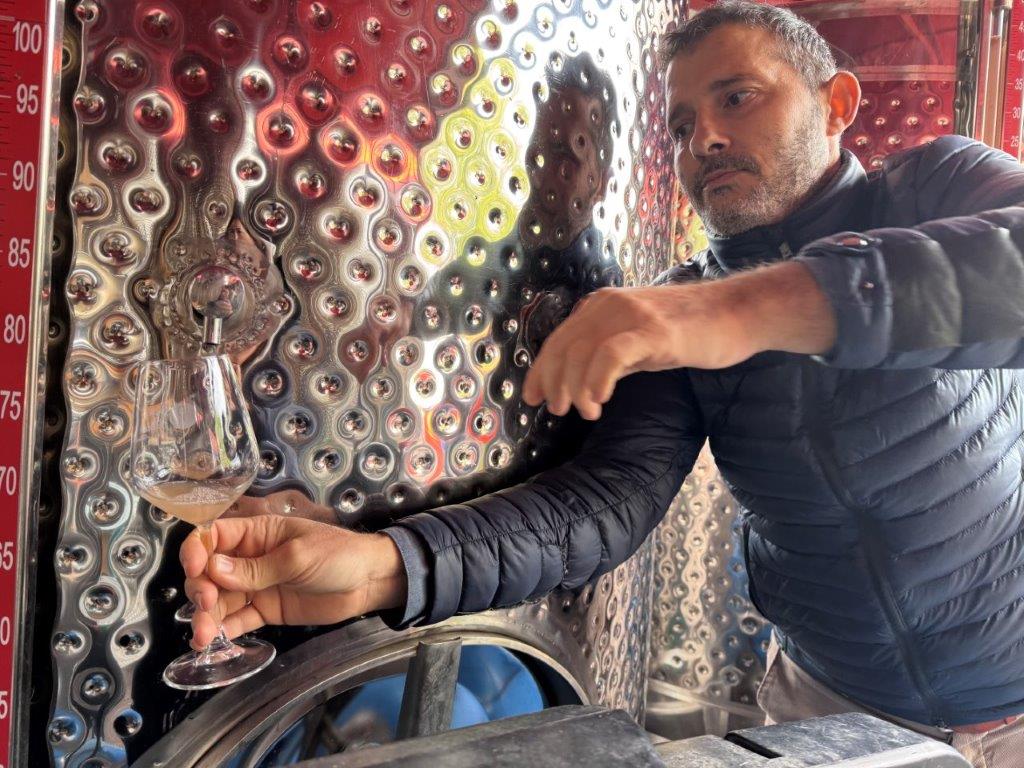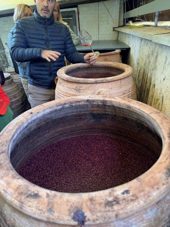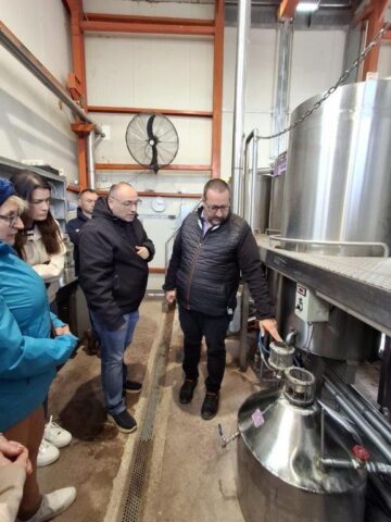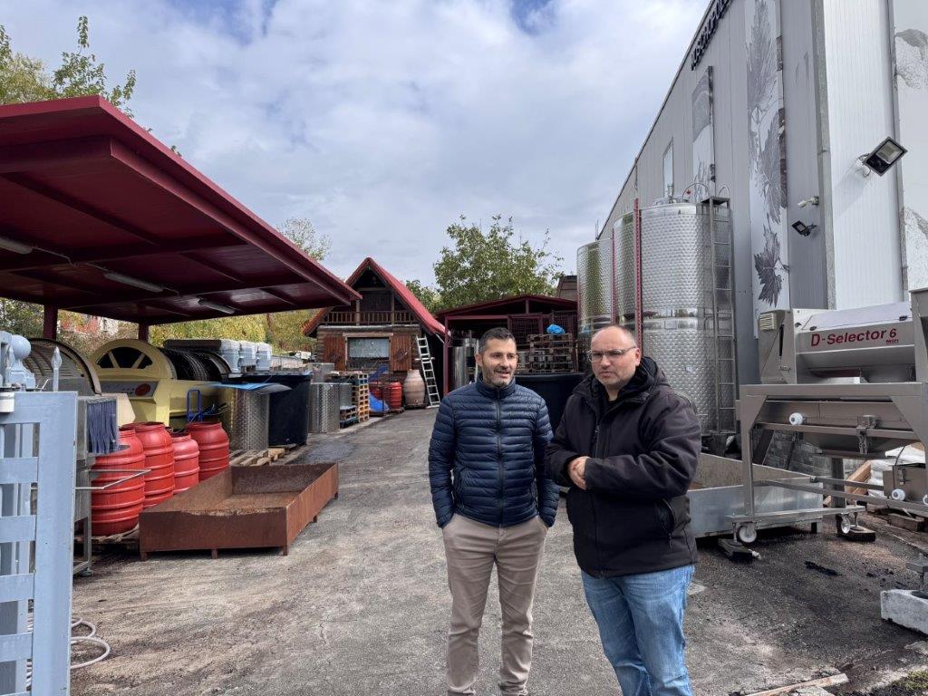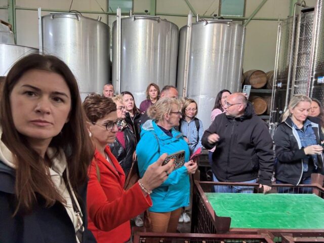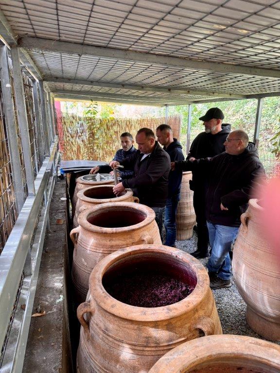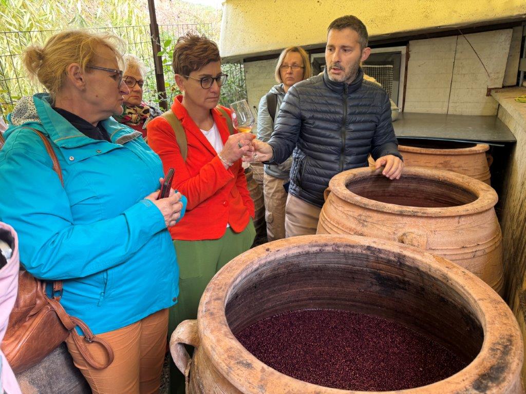 W winiarni Moschopolis powstają wina wysokiej jakości, z pełnym poszanowaniem środowiska. Jak podkreślał właściciel, produkcja wina to proces, w którym ważny jest zarówno człowiek, jak i natura – żaden z tych elementów nie może dominować. Uczestnicy wizyty trafili na szczególny moment w cyklu produkcyjnym – po zakończeniu zbiorów, kiedy winogrona zostały już zgniecione i znajdowały się w różnych etapach fermentacji w beczkach glinianych, drewnianych oraz metalowych. Proces produkcji rozpoczyna się od zbioru i odszypułkowania winogron, następnie owoce są starannie sortowane – tylko najlepsze trafiają do dalszego przetwarzania. Winiarnia posiada nowoczesną linię technologiczną, która pozwala w ciągu jednej godziny przetworzyć nawet 5 ton winogron. Cały proces odbywa się w higienicznych warunkach, a właściciele zwracają szczególną uwagę na czystość i kontrolę jakości. Pozostałości po produkcji – takie jak liście, łodygi i uszkodzone owoce – nie są marnowane. Zostają przekazywane do okolicznych gospodarstw rolnych jako pasza dla zwierząt, co idealnie wpisuje się w ideę gospodarki o obiegu zamkniętym. Sok z wybranych owoców pompowany jest do stalowych zbiorników, gdzie rozpoczyna się proces fermentacji. Uczestnicy mieli okazję skosztować 12-dniowego wina białego i czerwonego, znajdującego się jeszcze w trakcie dojrzewania. Była to niepowtarzalna możliwość porównania smaków na różnych etapach produkcji.