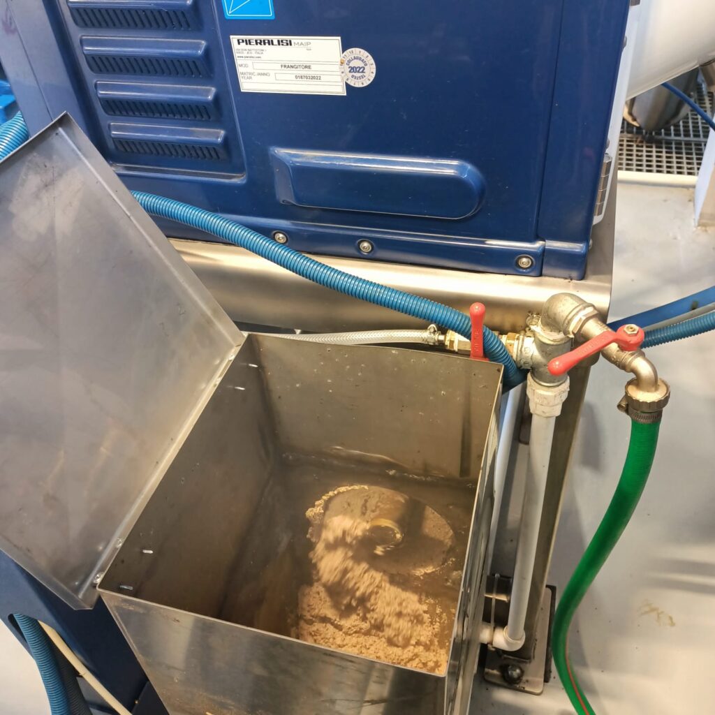 6. Maszyna oddziela pestki, które są magazynowane i trafiają do firmy produkującej biodiesel, a przetoczona oliwa zostaje poddana pierwszemu filtrowaniu.